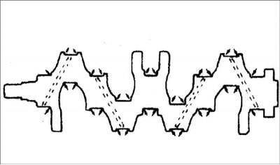 24. Снимите коленчатый вал с блока цилиндров и удалите деформированный пластиковый стержень Plastigage с шеек коленчатого вала и вкладышей коренных подшипников.