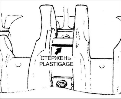 22. Выверните болты и снимите крышки коренных подшипников коленчатого вала. Измерительным шаблоном измерьте ширину деформированного пластикового стержня Plastigage и определите величину зазора.