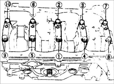 28. В определенной последовательности в 2–3 этапа затяните болты крепления крышек коренных подшипников коленчатого вала в следующем порядке: