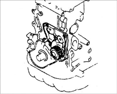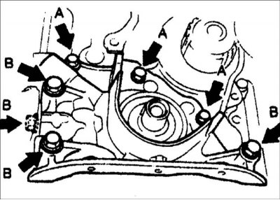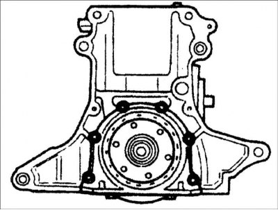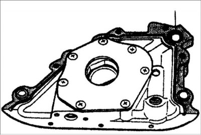9. Отверните болты и снимите переднюю крышку с масляным насосом с блока цилиндров.