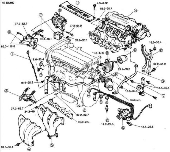 1. Снимите с двигателя FE DOHC следующие вспомогательные элементы: