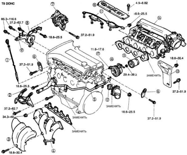 2. Снимите с двигателя Т8 DOHC следующие вспомогательные элементы: