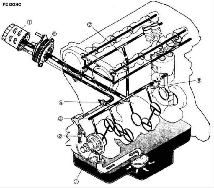 1 – масляный насос; 2 – перепускной клапан; 3 – главный канал подачи масла; 4 – датчик давления масла; 5 – масляный теплообменник; 6 – масляный фильтр; 7 – пробка маслосборника; 8 – распылитель масла.