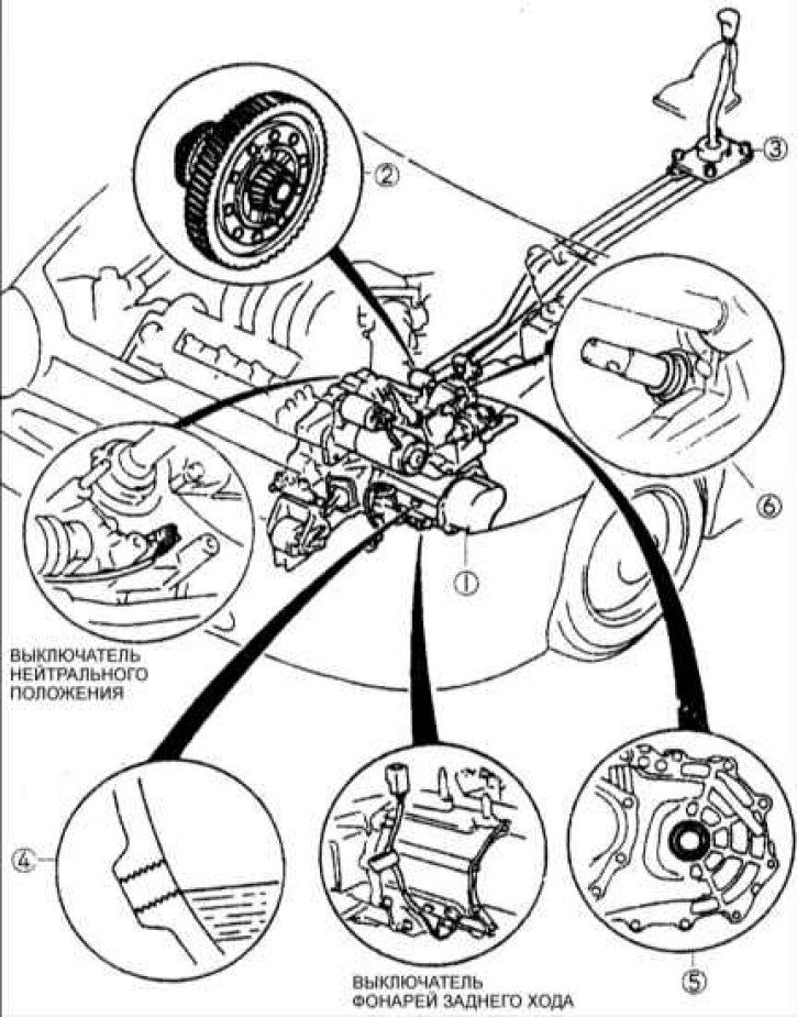 1 – коробка передач; 2 – дифференциал; 3 – механизм переключения передач; 4 – трансмиссионное масло; 5 – масляное уплотнение (дифференциала); 6 – масляное уплотнение (рычага перемены передач).