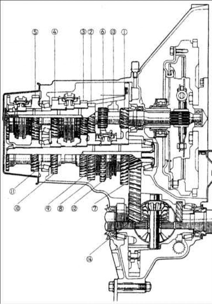 1 – ведущая шестерня 1–ой передачи; 2 – ведущая шестерня 2–ой передачи; 3 – ведущая шестерня 3–ой передачи; 4 – ведущая шестерня 4–ой передачи; 5 – ведущая шестерня 5–ой передачи; 6 – ведущая шестерня передачи заднего хода; 7 – ведомая шестерня 1–ой передачи; 8 – ведомая шестерня 2–ой передачи; 9 – ведомая шестерня 3–ой передачи; 10 – ведомая шестерня 4–ой передачи; 11 – ведомая шестерня 5–ой передачи; 12 – ведомая шестерня передачи заднего хода; 13 – промежуточная шестерня передачи заднего хода; 14 – дифференциал.