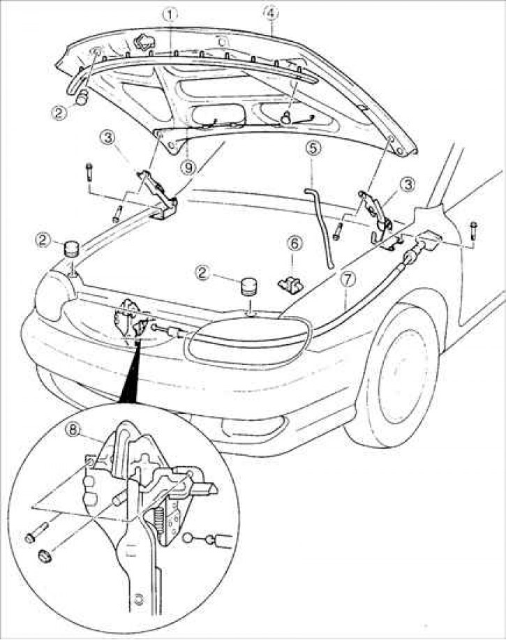 1 – влагозащитная полоса; 2 – резиновый упор; 3 – шарнир капота; 4 – капот; 5 – опора капота; 6 – держатель опоры капота; 7 – трос открытия замка капота; 8 – замок капота (защелка); 9 – шланг омывателя ветрового стекла.