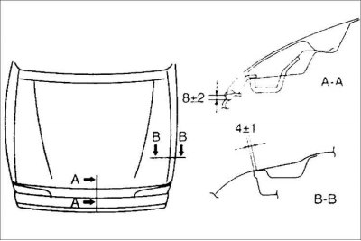 4. Проверьте зазоры по периметру капота. При необходимости, перемещая капот в удлиненных отверстиях для болтов крепления капота, отрегулируйте положение капота так, чтобы зазоры по периметру были равномерными и соответствовали требуемым значениям. После регулировки положения, затяните болты крепления капота.