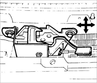 5. Проверьте выравнивание стопорного механизма и ударной пластины капота. При необходимости, ослабьте болты и, перемещая, отрегулируйте положение ударной пластины капота.