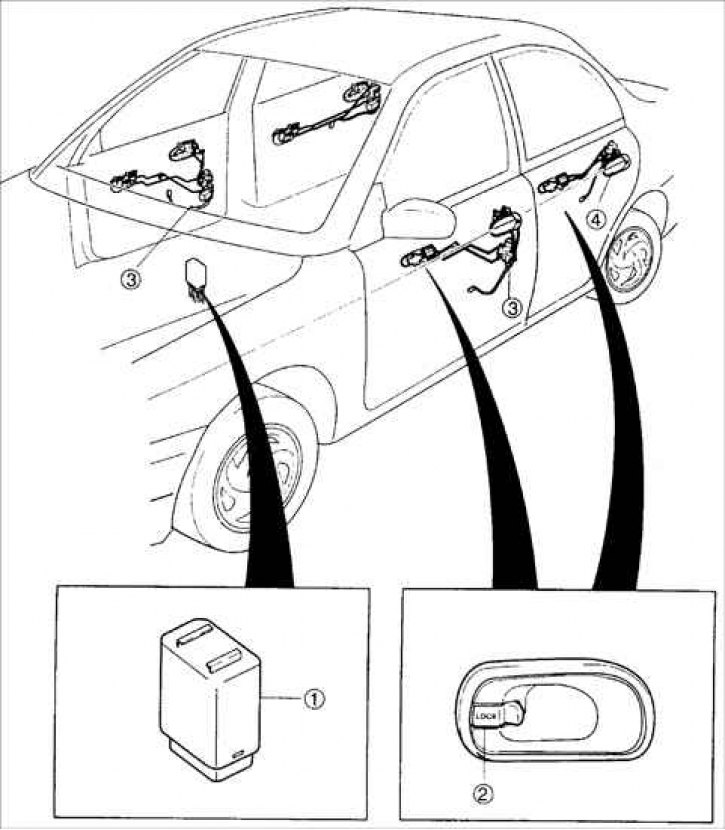1 – реле центрального управления замками дверей; 2 – кнопка блокировки замков двери; 3 – замок передней двери; 4 – замок задней двери.