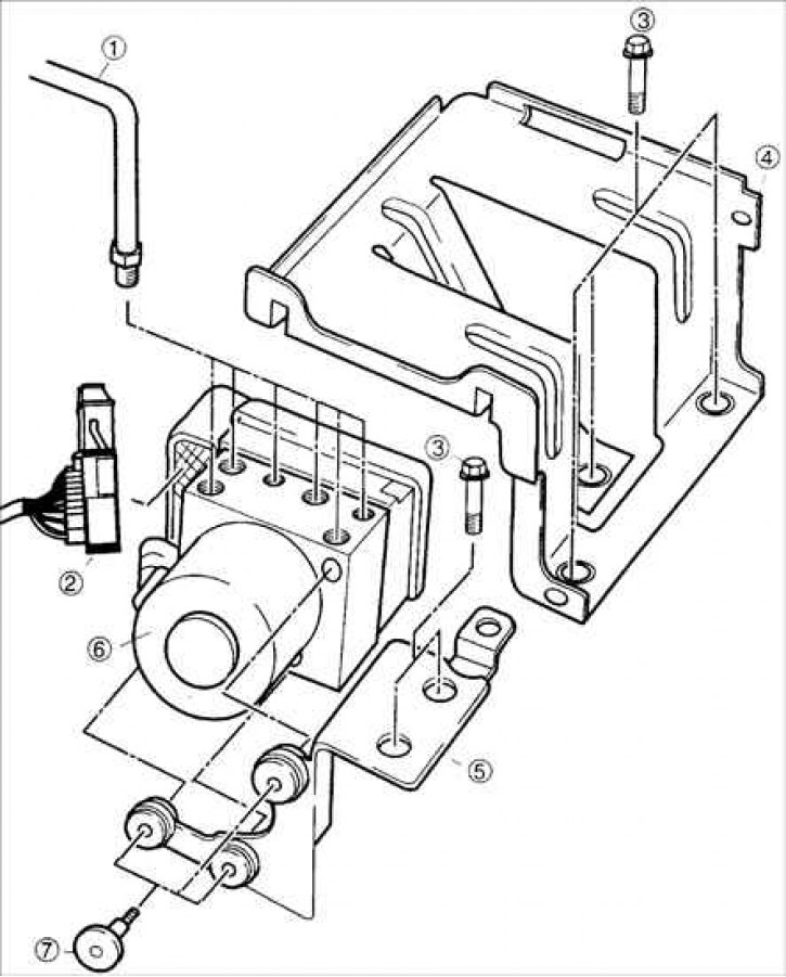 1 – тормозная трубка; 2 – разъем; 3 – болты; 4 – кронштейн блока предохранителей; 5 – кронштейн HCU; 6 – блок гидравлического управления (HCU); 7 – винт.
