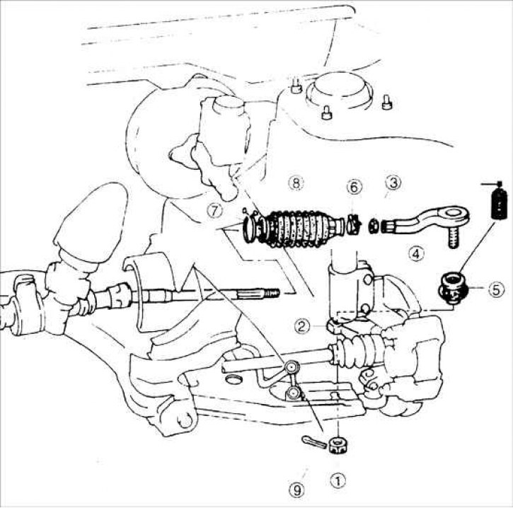 1 – гайка (заменить); 2 – поворотный кулак; 3 – контргайка; 4 – наконечник рулевой тяги; 5 – защитный чехол шарнира наконечника рулевой тяги; 6 – хомут; 7 – хомут; 8 – защитный чехол рулевой тяги; 9 – шплинт (заменить).