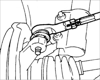 5. Извлеките шплинт и отверните гайку крепления цапфы шарового шарнира наконечника рулевой тяги к поворотному кулаку.