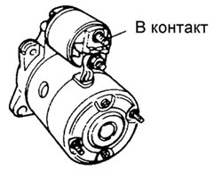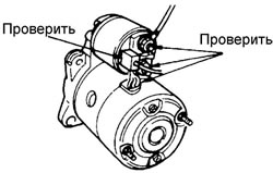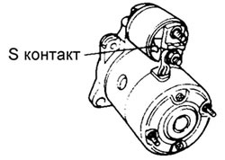 | 3 | Проверьте, подается ли напряжение аккумуляторной батареи к контакту S тягового реле при нажатой педали сцепления (на автомобилях с механической коробкой передач) или при установке рычага селектора в позицию Park (на автомобилях с автоматической коробкой передач) и повороте ключа в замке зажигания в положение START ![]() | Да | Замените стартер |
