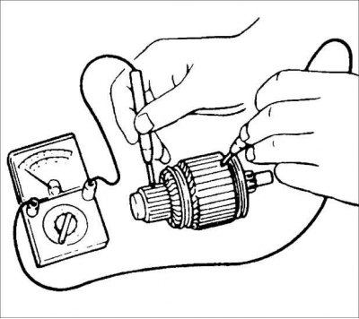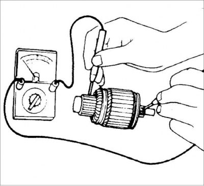 2. Омметром проверьте проводимость между щетками коллектора и валом ротора. При наличии проводимости, замените ротор.