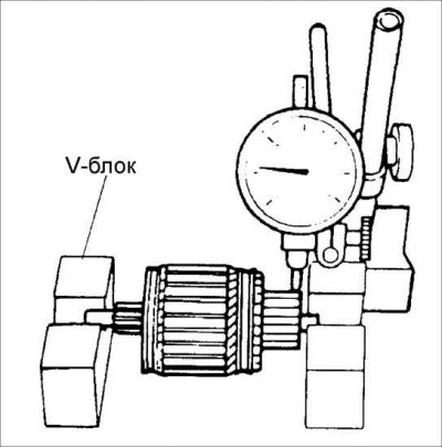 3. Установите ротор на V-образных блоках и, индикатором часового типа, проверьте биение коллектора. Если биение превышает предельно допустимое значение, проточите коллектор или замените ротор.