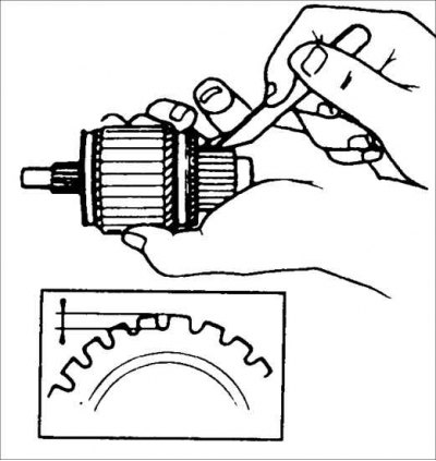 6. Если глубина канавок между контактными пластинами коллектора меньше предельно допустимой величины, замените ротор.
