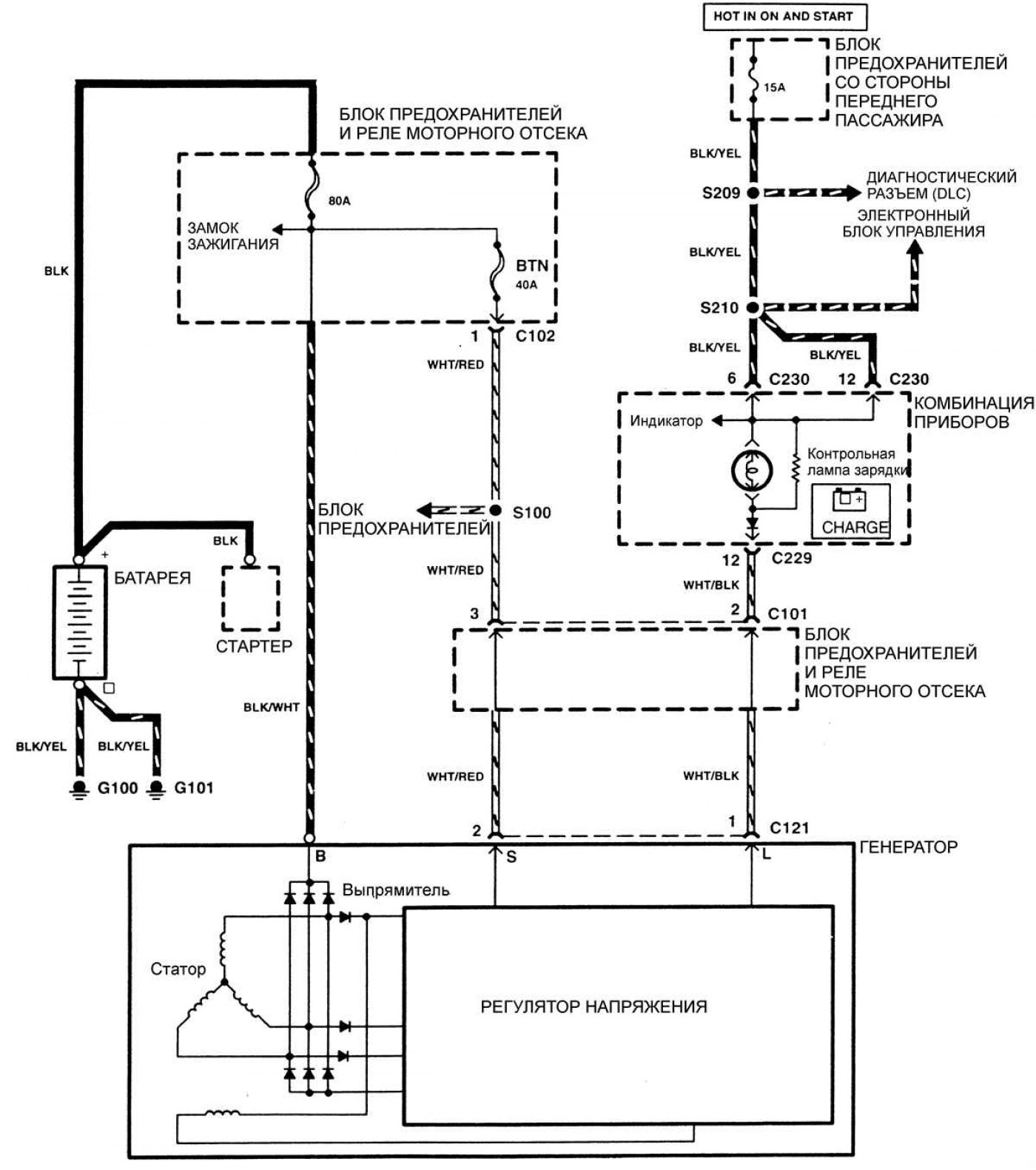 Статья о ремонте южнокорейских автомобилей Киа Шума 1 (1997-2001): Электросхема системы зарядки: http://www.kmanual.net/more/Shuma-1/electrics/schemes/elektroshema-sistemy-zaryadki
