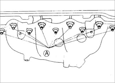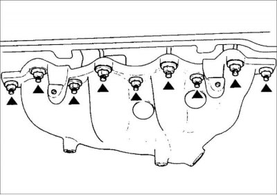 17. Выверните болты и снимите выпускной коллектор с головки блока цилиндров.