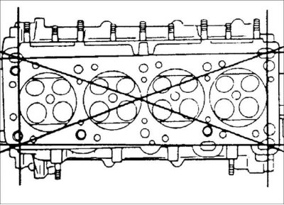 21. В определенной последовательности, за 2–3 этапа выверните болты крепления головки блока цилиндров.