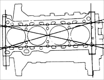 10. Если неплоскостность превышает допустимые пределы, перешлифуйте блок цилиндров. Максимально допустимая перешлифовка: 0,20 мм.
