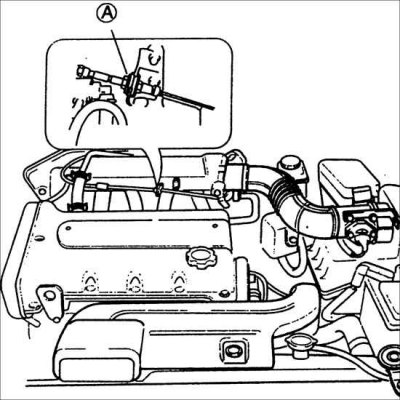18. Установите трос акселератора и проверьте его провисание. При необходимости, отрегулируйте провисание вращением гайки А.