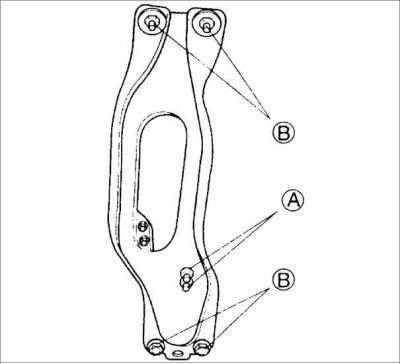 6. Затяните гайки А и болты В крепления пластины защиты двигателя.