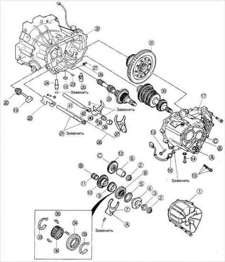 1 – задняя крышка; 2 – контргайка; 3 – муфта синхронизатора задней передачи; 4 – конусная втулка задней передачи; 5 – блокирующее кольцо синхронизатора; 6 – распорная втулка; 7 – вилка 5-ой/ задней передачи; 8 – синхронизатор 5-ой/ задней передачи; 9 – блокирующее кольцо синхронизатора 5-ой передачи; 10 – ведущая шестерня 5-ой передачи; 11 – втулка шестерни 5-ой передачи; 12 – ведомая шестерня 5-ой передачи; 13 – болт; 14 – болт; 15 – пробка фиксатора, пружина и стальной шарик; 16 – выключатель фонаря заднего хода; 17 – картер коробки передач; 18 – магнит; 19 – промежуточный вал передачи заднего хода; 20 – промежуточная шестерня передачи заднего хода; 21 – шток переключения 3-ей/ 4-ой передач; 22 – рычаг штока переключения 5-ой/ задней передач; 23 – штифт; 24 – вал рычага переключения; 25 – рычаг переключения в сборе; 26 – вилки и шток переключения; 27 – шариковый фиксатор; 28 – пружина; 29 – первичный вал; 30 – вторичный вал; 31 – дифференциал; 32 – картер сцепления; 33 – пружина сухаря фиксатора; 34 – скользящая муфта синхронизатора; 35 – сухарь фиксатора; 36 – ступица муфты синхронизатора; 37 – вилка переключения 3-ей/ 4-ой передач; 38 – втулка; 39 – рычаг управления; 40 – вилка переключения 1-ой/ 2-ой передач; 41 – шток; 42 – рычаг штока.