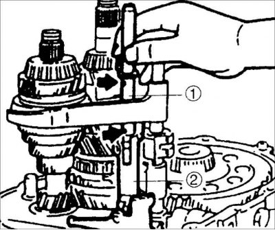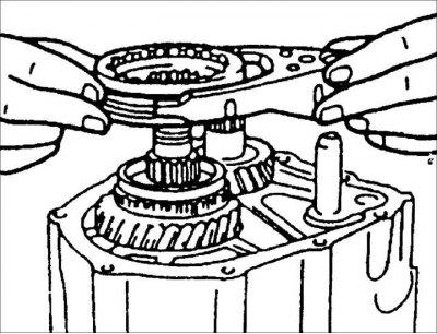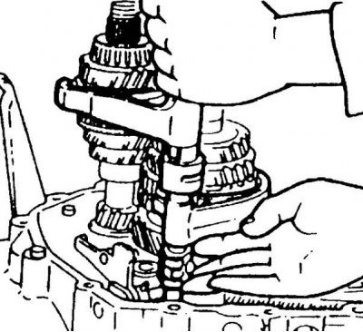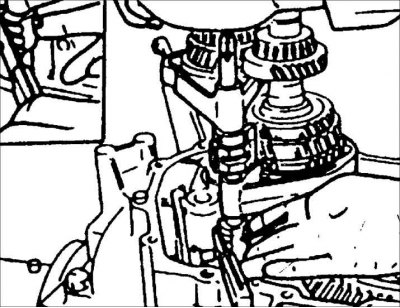 1. Одновременно включите шестерни 1-ой и 2-ой передачи, для того чтобы не проворачивался первичный вал коробки передач.