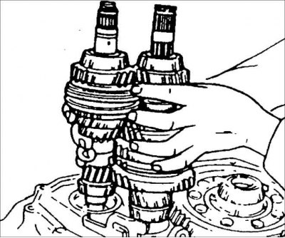 Установите первичный и вторичный валы в картер сцепления так, как показано на рисунке.
