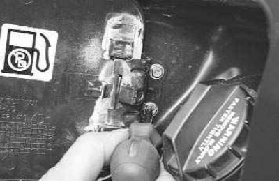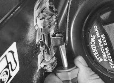 1. Отсоедините от петли фиксатор троса пробки заливной горловины.