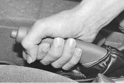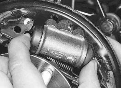 5. Поднимите рычаг стояночного тормоза – верхние концы колодок отойдут от упоров поршней.