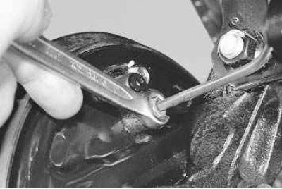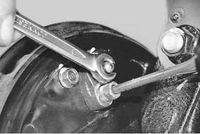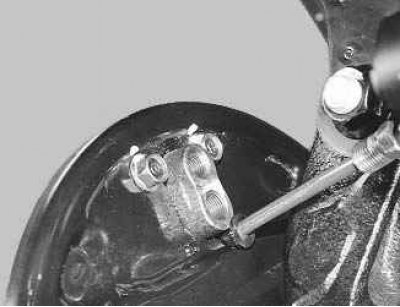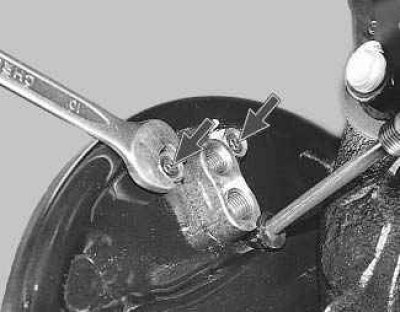 Примечание. После длительной эксплуатации гайка тормозной трубки «срастается» с трубкой в единое целое, при попытке отвернуть гайку трубка скручивается и ломается. В этом случае лишь немного строньте гайку трубки, затем выверните болты крепления цилиндра и отсоедините его от трубки, свинчивая цилиндр с ее гайки. После отсоединения цилиндра от трубки подвижность освободившейся гайки можно восстановить, смочив ее тормозной жидкостью и поворачивая ключом попеременно в обе стороны.