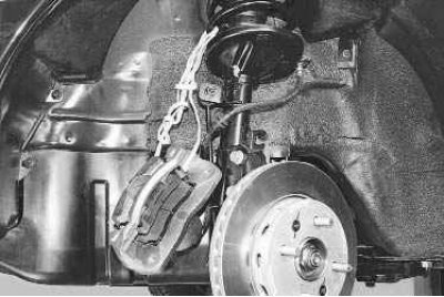 3. Снимите суппорт в сборе (см. «Замена суппорта переднего тормозного механизма»), не отсоединяя тормозной шланг, и закрепите проволокой, не допуская скручивания или натяжения шланга.