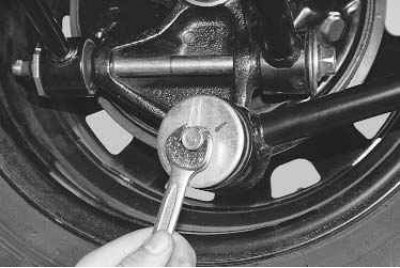 3. Выверните болт крепления продольного рычага к втулке кулака задней подвески...