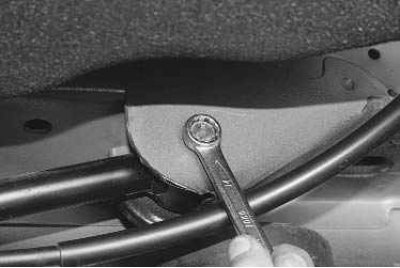 2. Отверните две гайки крепления кронштейна троса привода стояночного тормоза к продольному рычагу задней подвески и отведите трос в сторону.
