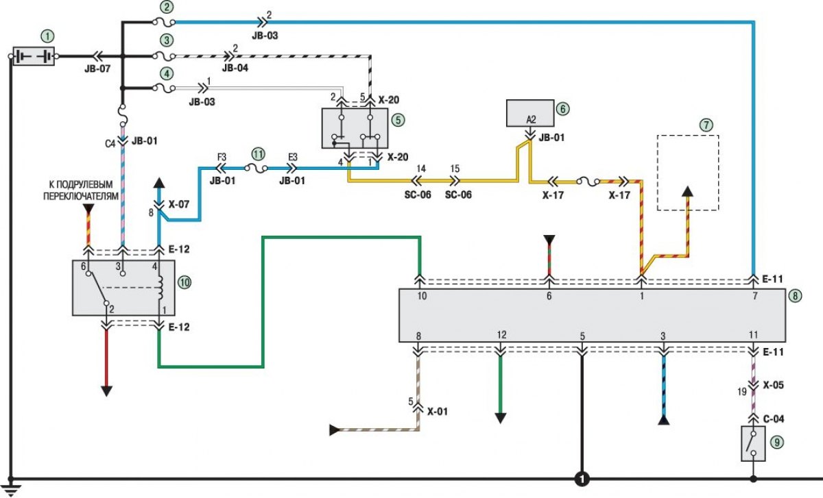 1 - аккумуляторная батарея; 2 - плавкая вставка TNS (30 А); 3 - плавкая вставка IG2 (30 А); 4 - плавкая вставка IG1 (20 А); 5 - выключатель (замок) зажигания; 6 - соединительный блок; 7 - блок иммобилизатора; 8 - электронный блок системы DRL; 9 - выключатель сигнальной лампы включения стояночного тормоза; 10 - реле системы DRL; 11 - плавкая вставка HEAD (25 A)