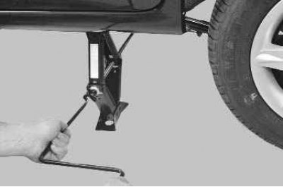 Внимание! Перед подъемом колеса включите I передачу, затормозите автомобиль стояночным тормозом и подложите упоры под колеса с противоположной стороны.