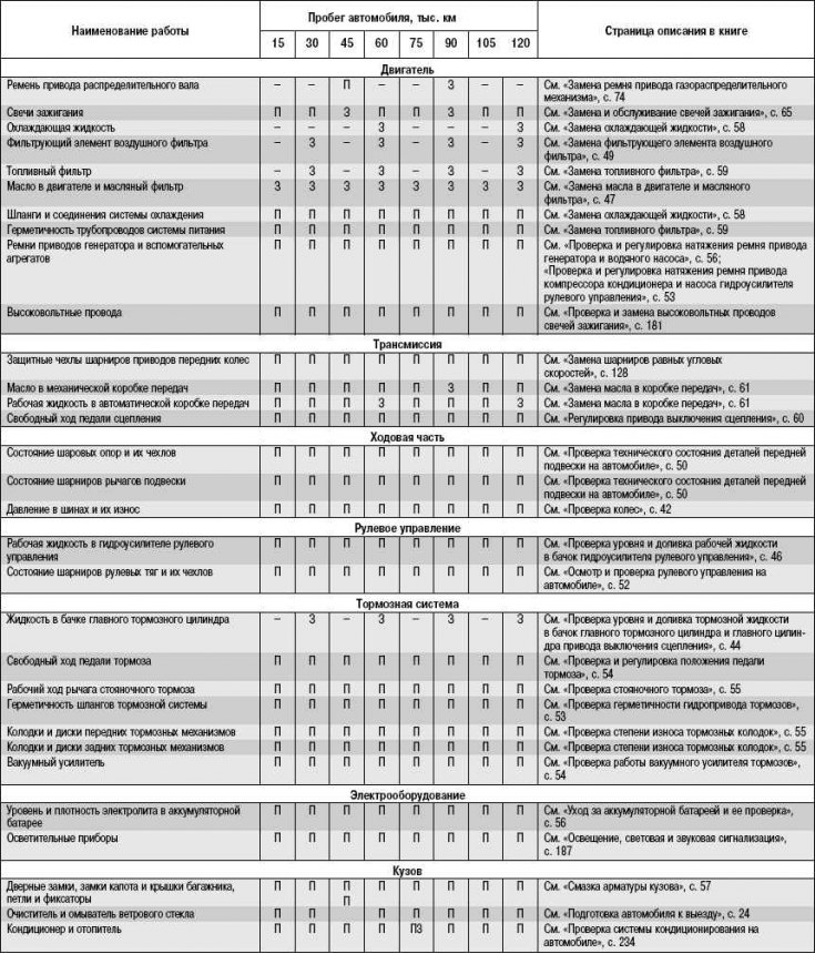 - П – проверка (при необходимости замена/доливка/регулировка/смазка);