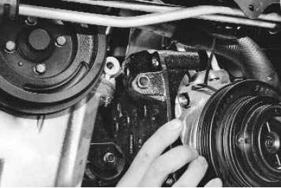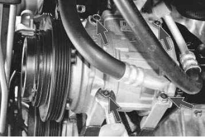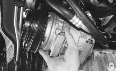 5. Выверните болты крепления компрессора кондиционера к кронштейну блоку цилиндров и, не отсоединяя от него трубопроводы...