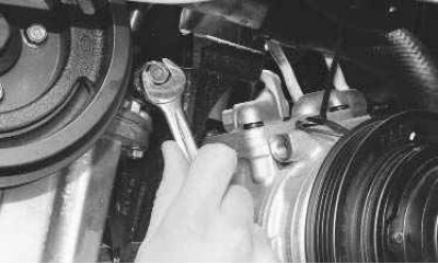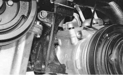 8. Выверните болты крепления кронштейна компрессора кондиционера к блоку цилиндров со стороны масляного насоса...