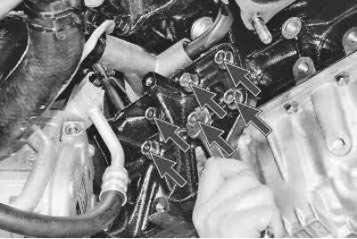 11. Снимите ремень привода газораспределительного механизма (см. «Замена ремня привода газораспределительного механизма»).