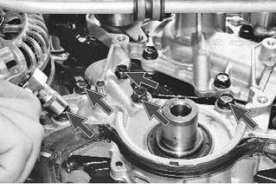 16. Выверните болты крепления масляного насоса к блоку цилиндров...