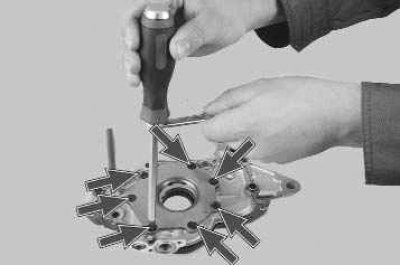 Примечание. При каждом снятии насоса заменяйте передний сальник коленчатого вала (см. «Замена сальников коленчатого вала двигателя»).