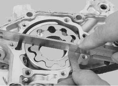 30. Металлической линейкой и щупом измерьте боковой зазор шестерен масляного насоса. Зазор должен составлять 0,18 мм.