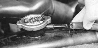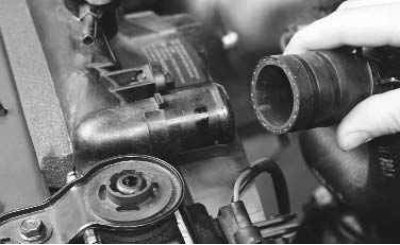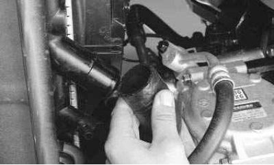 Примечание. Для того чтобы в дальнейшем исключить возможность подтекания охлаждающей жидкости, перед установкой шлангов смажьте патрубки радиатора тонким слоем силиконового герметика.