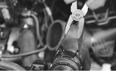 6. Ослабьте хомут крепления шланга к патрубку радиатора, сжав пассатижами его отогнутые ушки, сдвиньте хомут по шлангу...