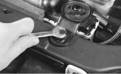 10. Выверните болт крепления верхней опоры радиатора к верхней поперечине рамки радиатора...