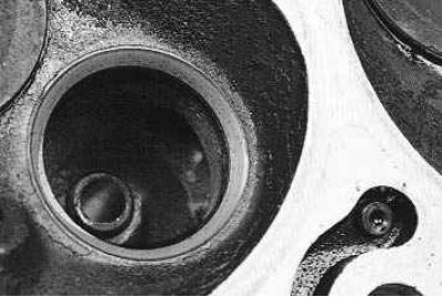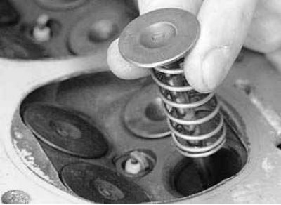 3. Наденьте на стержень клапана предварительно подобранную пружину и вставьте клапан в направляющую втулку со стороны камеры сгорания, смазав стержень клапана слоем графитной смазки.