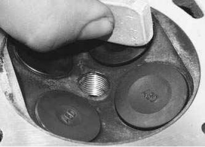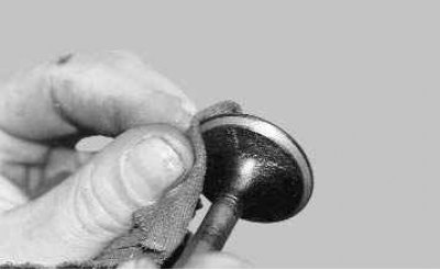 8. После притирки тщательно протрите клапан и седло чистой тряпкой и промойте, чтобы удалить остатки притирочной пасты. Проверьте герметичность клапана, для чего установите его в головку с пружинами и сухарями. Затем положите головку набок и залейте керосин в тот канал, который закрыт клапаном. Если в течение 3 мин керосин не просочится в камеру сгорания, клапан герметичен.