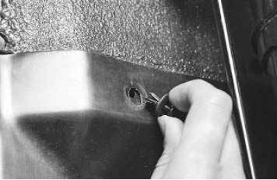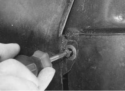 1. Выверните пластмассовый фиксатор и извлеките передний пистон крепления брызговика двигателя.